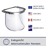 INTERNATIONAL STANDARDS — Meets ANSI Z87.1 (US), CE EN ISO 16321-1 (Europe), CSA Z94.3 (Canada), AS/NZS 1337.1 (Australia and New Zealand) IMPACT RESISTANCE (AT ROOM TEMPERATURE) - Tested hundreds of times in the lab, our face shields can withstand impact of 6mm steel ball traveling at a speed of 300 MPH easily. IMPACT RESISTANCE (AT EXTREME TEMPERATURE) - Made of extrusion-grade polycarbonate, our face shields can withstand the impact of a 6 mm steel bead traveling at a speed of 268 MPH at extremes of temperatures (from -23°F to +122°F). BEST OPTICAL QUALITY - Tested by ANSI Z87.1 (All Optical Requirements are PASSED) APPLICATION – Safety Face Shield Adapter Brackets are designed to be used with cap-style hard hats EASY INSTALLATION - The swivel pins of the outer frame hold the face shield and the inner frame attaches securely to the round-brim cap-style hard hat MADE IN TAIWAN - Factory Direct, ISO 9001 certified.