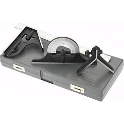 The SPI 4-piece combination square set features a 12 inch hardened steel blade with 4R (1/8", 1/16", 1/32", and 1/64") graduations The center head, non-reversible protractor head, and square head are cast iron A satin chrome finish on the blade paired with crisp black graduations makes the blade easy to read Fitted storage case is included