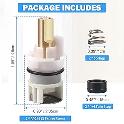 - Features: 【Wide Application】 This RP25513 faucet stem assembly repair kit can be used for delta two handle bathroom faucet. It can be applied for fixing leakage due to the failure of stem, spring or seat. Works on both hot and cold. 【Safe Design】 The RP25513 valve cartridge adopt pressure balance design, single function pressure balance temperature control, can keep the water temperature within a safe range of ±3.6°F (±2°C) that is safe for the human body, helping to protect you from sudden changes in the pressure of cold or hot water when showering. 【Superior Quality】 Brass stem and stainless steel plate add extra strength. Sturdy stem unit assembly, Helps keep a faucet running smoothly. The shower core adopts a plastic structure as a whole, improves the durability of the product, prolongs the service life, saves water and money. It is completely suitable for your faucet. 【Easy to Use】 Easy to install and repair the leaking faucet, no need to replace the entire faucet. Turn off the water valve, then remove the faucet, loosen and remove the stem assembly with a wrench, then replace it with the new parts, and finally tighten the faucet. Enough quantity can satisfy your inventory and daily. Specifications: Brand: TOVEN-RV Condition: Brand New Compaitble with: Replacement for delta double handles faucet Package Included: Stem*2 , 1/4 Turn stop*2 , Rubber seat*2 , Spring*2 ATTENTIONS: ● Please clarify the product model and confirm the year of your faucet in advance. ● Before inserting a new stem asembly, please clean up the sediment and debris in the pipeline ● Please make sure that the water supply is turned off when installing, and pay attention to check the water pressure