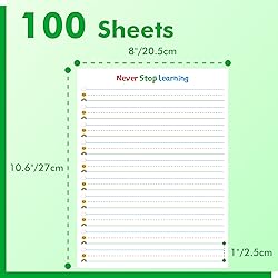 - Gethelud is an experienced early educational tools supplies producer and aiming to provide the best quality and user experience. Contents: It comes with 100 sheets (200 pages) handwriting practice paper, sufficient quantity to meet different needs. Each sheet measures about 8” x 10.6” and line spacing between blue and green line is 1 inch, perfect for pre-K and kindergarten students to practice handwriting. Double Sided Printed: The ruled paper utilizes double-sided printing, offering abundant writing space while also conserving paper resources. It offers 1" line spacing, giving children ample space to experiment with letter size, proportion, and spacing. The increased line spacing accommodates their fine motor skills, allowing them to focus on refining their letter shapes and sizes without feeling constrained by narrow lines. Premium Quality: The notebook is made of 80gsm paper, which is thick enough to prevent ink from bleeding through and ensuring smooth writing experience. It features a single-sided adhesive design, allowing for easy tearing of each page after use. It is convenient to use. Attractive Style: The ruled writing paper for pre-K is thoughtfully designed with the intention of captivating beginners. It features vibrant graphics like cloud, sun and rainbow, not only add visual appeal but also instill a sense of accomplishment in children as they master the correct formation of letters. Wide Usages: Our handwriting practice paper is to assist young learners in developing their writing skills. It serves as a tool that supports the early stages of handwriting development by providing a structured framework for pre-K students to practice letter formation and spacing. It is perfect for students in preschool, kindergarten, 1st grade, 2nd grade, elementary school, homeschooling, daycare.