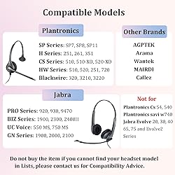 - DO NOT buy the item if you can’t find your headset model in list. For other headsets, please consult us for Compatibility Guide. Compatible Headset List (included but not limited) Plantronics SP Series: SP7, SP8, SP11, SP11-A, SP11-C, SP12. Plantronics CS Series: CS510, CS510-XD, CS520-XD. Plantronics HW Series: Supra Plus Encore HW111N, HW291N, HW510, HW510V, HW520, HW520V, HW251N, HW261N, HW710, HW720. Plantronics: H251, H251N, H261, H261N, H351, H351N, H361, H361N, H51, H51N, H61, H61N, H91, H91N, H101, H101N. Plantronics EncorePro 310/320 Series, Plantronics EP310/320. Plantronics Blackwire: 3310-A, 3310M-A, 3315-A, 3315M-A, 3310-C, 3310M-C,3315-C, 3315M-C, 3320-A, 3320M-A, 3325-A, 3325M-A, 3320-C, 3320M-C,3325-C, 3325M-C, C215, C225, C310, C320, C3210, C3210 USB-C, C3220, C3220 USB-C, C3215, C3215 USB-C, C3225, C3225 USB-C. Jabra PRO Series: 920, 935, 930, 9450, 9460, 9465, 9470, 9400BS. Jabra GN Series: GN1900, GN2000, GN2100, GN2025, GN9120, GN9125, BIZ Series BIZ 620, Biz 1100, BIZ 1500, Biz 1900, Biz 2300, Biz 2400II. (NOT for Jabra Evolve 20 Evolve 30 Evolve 40 Evolve 65 Evolve 75 and Evolve2 Series) Jabra UC Voice: 550 MS, 750 MS, 550A. Yealink: YHS33 Series Sennheiser: SC 60 USB ML, SC 75, SD Pro2. Leitner: LH270, LH275. VXi BlueParrott: B250-XTS. TruVoice: HD-500. IPD: IPH-160 Cyber Acoustics: AC-104, AC-204. AGPTEK/Arama/MAIRDI/Callez/VoiceJoy Office Headset and Most Standard Size Headsets with the same specification.