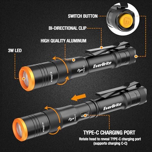 - EverBrite Mini Pen Light, Rechargeable Pocket Pen Flashlight with USB C Cable, 4 Light Modes, 300 Lumens Small Flashlight with Clip for Inspection, Repair, Outdoors, Emergency, Black