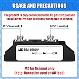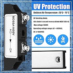 Package Contents: you will receive 1 MD 55A-16 solar diode, This model is anti-reverse diode MD 55A-16; Peak voltage 1600V; AC < 400VAC ; DC 3-1000VDC Current : if your current is 10 20 30 40 50Amp 12V 24V 48V, you can use this 55 A instead Note: because it is commonly used in solar energy and photovoltaic power generation, and is often paired with solar cells and solar panels, some customers might refer to it as a " solar diode; " Using four diodes together can act as a rectifier bridge Attention: the higher the temperature, the worse the effect may be, Note: therefore, when using 12v diode, please avoid contact with high temperature conditions to avoid damage to the diode Common in Life: the frequency of use of our diode in life is also relatively high, when you need it, it can be very convenient to help you solve your work