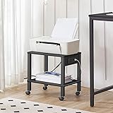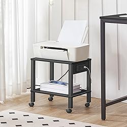 Power Socket: This printer stand has a practical socket with 1 outlet and 2 USB ports to easily charge your e-devices. No worry about not being able to prepare meeting materials on time, this printer stand with a socket enables you to work efficiently Office Assistant: Is your printer taking up too much space on your desk and too far away? This printer shelf solves all troubles. 2 open shelves keep your office devices within reach. 4 smooth wheels make it easy to move it to suit your needs Sturdy and Durable: This printer cart is made of quality 15mm particleboard, providing excellent durability and weight-bearing capacity. Each tier can hold up to 44 lb, ensuring reliable support for the printer, scanner, or other office supplies Space-Saving: With dimensions of 15"L x 11"W x 12.5"H, this printer stand maximizes the use of both desktop and under-desk space. No more worries about tangled cables and cluttered desks. Keep your workspace neat and organized Easy Installation: The printer stand has a simple structure and comes with complete accessories. Simply follow the instructions. No need for complex tools or long waits. Get your printer securely installed on the stand immediately