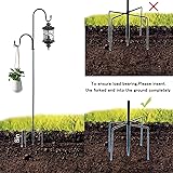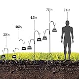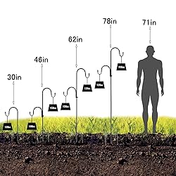 【STURDY & DURABLE】 With a 3/4 inch diameter wrought iron metal garden hanging hooks, At a height of 30", each hook is suitable weight that no more than 15lbs; 46" in height fits no more than 12lbs;62" in height fits no more than 10lbs;78"in height fits no more than 8lbs.(NO OVERLOADING) Tip: On both hooks Hanging items makes it easier to balance.The 5 base prongs must all be plugged into the lawn to be provide better stability. 【HEIGHT ADJUSTABLE】You can free to adjustable the suitable height for 78 ", 62 ", 46"or 30", it depending on what you would like to hang,as also single hook or double hook to install and use.Disassembly could also be easily down by unscrewing the threads, you could store the parts in any corner of your house. 【MULTI APPLICATIONS】This heavy duty shepherd’s hook can hanging holiday decorations, flower balls, flower pots, string lights, lanterns, hanging planter, flower jars, candle holders, mason jars, ornaments, wind chimes, bird baths, shooting targets, light post, isle markers or any others you want to hanging! You can use it in anywhere like flower beds, at weddings, camping.You will be amazed at how useful they can be.(2 Pack of 4 hooks). 【5 PRONGED DESIGN】The base of the shepherd hooks outdoor is constructed with two double-forked based prongs and an extra long one. The 5 base prongs provide better stability to the shepherd hooks,much better than 2 or 3 prongs,It will be more stable.so you can easily install it into the ground to elevate the look of your garden and outdoor space. 【NOTES】 We don’t recommend putting these metal hook hangers into soft moist soil or hanging overloads, which may cause the hook to tip over or bend down. If you have any questions about quality during use, please feel at ease to contact us.
