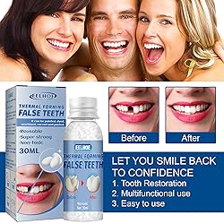 - You'll get :30ml tooth pellet adhesive, enough for your daily needs, Halloween makeup and other DIY supplies for repairing missing and broken teeth, or gluing dentures. Easy to use: First you can put the material into boiling water at 100 degrees Celsius, depending on the size of the missing teeth; Then you can stir a few times with a spoon to mix; Once the materials are combined, the teeth can be shaped; After cooling at room temperature, the material hardens, is placed on the missing tooth, and then rinsed in cold water to speed up the cooling process Versatile: This tooth solid gel not only works as a makeup tool for Halloween, it can also help you cover irregular, stained, lost and broken teeth with a beautiful appearance, while not affecting your daily life and making your smile more confident. Natural safety: The color of tooth pellet adhesive is the color of most people's teeth, so it can meet the needs of most people, and at the same time, when you use it, it looks just like your natural teeth and the color is natural, so you don't need to feel embarrassed about wearing it Tips: Do not drink hot drinks when wearing dental solid glue; Please be careful not to burn when making tooth solid glue; Keep small, inedible items away from children.