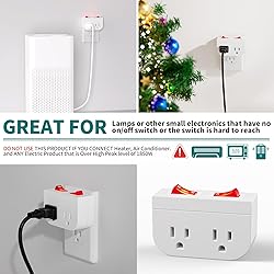 CONVENIENT - Ideal for devices and peripherals that lack a built-in on/off switch, this product is perfect for easily controlling power to hard-to-reach lights or appliances without their own switch. Simply plug in and toggle as needed, offering convenience in any setting. CERTIFIED SAFETY - ETL Listed for reliable safety and performance. SPECIFICATIONS - Rated at 15A, 125V, 60Hz, and 1875W, this unit is compatible with any standard AC outlet, ensuring broad compatibility with household devices. ENERGY SAVING - Helps reduce electricity consumption by completely cutting off power to devices when switched off, preventing energy waste and saving on utility bills. VISUAL INDICATOR - Equipped with red light that illuminates when the switch is on, this feature is especially useful for identifying the power status from across the room or in dark environments. VERSATILE USE - These small but handy devices have a wide range of applications, making them perfect for controlling items such as popcorn makers, Christmas lights, lamps, fans, chargers, appliances, electronics, and more.