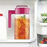 - This Takeya pitcher bundle includes two 2-quart BPA-free plastic pitchers in raspberry and blueberry colors. The pitchers feature airtight, leakproof lids that seal to keep beverages fresh and allow convenient upright or sideways refrigerator storage. Both durable, shatterproof pitchers are great for making iced tea, lemonade, cold brew, sangria or smoothies. The raspberry pitcher is made in the USA and comes from Takeya's line of innovative hydration solutions inspired by over 55 years of Japanese design heritage. It can withstand boiling to ice cold temperatures. The blueberry pitcher has the same leakproof, airtight design and BPA-free Eastman Tritan plastic construction. With two colors and 2-quart capacity each, this versatile pitcher duo is perfect for preparing refreshing chilled beverages for the whole family. The vivid colors and matching leakproof lids create a coordinated look for serving cold drinks in style. Takeya's innovative functional design allows you to mix up tasty infused beverages in the airtight pitchers and store them conveniently without worrying about leaks or spills.