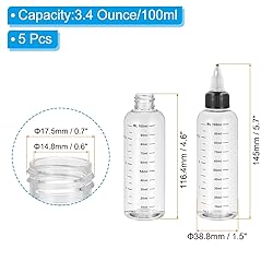 Specification: Capacity:3.4 Ounce/100ml; Overall Size(inch): 145 x 38.8mm/5.7 x 1.5inch(H*OD); Bottle Height: 116.4mm/4.6inch; Mouth Inner Diameter: 14.8mm/0.6inch; Mouth Outside Diameter: 17.5mm/0.7inch; Color: Transparent(Bottle Body); Black(Bottle Cap); Material: Plastic; Packing List: 5Pcs x Dispensing Bottle Advantage: The dispensing bottles are made of durable polyethylene material, which is not easily broken and deformed and can be used for a long time; Transparent bottle color allows you to distinguish the liquid in the bottle. Clear graduation lines allow you to read the volume of your liquid; The Plastic screw cap tight seal prevents leakage of your liquid. Squeeze-out tips make it convenient to control the liquid flow. Application: The dispensing bottle is widely used in the kitchen, home, and laboratory for dispensing or storage of liquid, oils, sauces, and dyes. They are suitable for cakes, cookie making, crafts making. Instruction: Twist off the cap, pour the liquid into the bottle, and close the cap. Note: Please check the size before purchasing. Please avoid light when using to extend the use time of liquid and bottle.