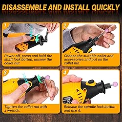 【Speed Adjustment & Flex Shaft】: The rotary tool equipped with a powerful 170w motor, 1.8m flexible shaft, 8000~35000RPM, 6-speed adjustment, gear adjustment making it easier and more table to adjust the speed, helping to complete handwork from cutting metal to polishing jewelry. The detailing kit with flexible shaft like a pen reduce vibration and better control for precision, corner polishing. 【127pcs Accessories Multi-purpose】: Cover Shield provide better protection for cutting and grinding. Drill Locator helps for precision woodworking. Buffing wheel can repair dents and clean surface dirt for a smoother, cleaner finish.Home rotary tool kit with multitools accessories, as mini sander tool, polisher, die grinder, wood carving/sculpting tools, grout removal tool, metal cutter, engraver etc, and enabling you to achieve different crafting work efficiently. 【ERGONOMIC DESIGN】: The body of the rotary tool is designed with soft rubber to ensure comfort during long hours of work.Assist handle for two-handed grip operation helps making better control for delicate work. The Ventilation holes in the housing dissipate heat during operation, maintaining consistent performance and extending the life of the tool. 【More Compatibility】: This power rotary tool is equipped with 4 collets: 1/8", 2x 1/16"((1 has been mounted on the tool), 3/32", offers wider compatibility and more stable when setting accessories for grinding, cutting, wood carving, sanding, engraving, and other working tools. The 3-jaw universal chuck stabilizes your project and allows to quickly and easy change accessories on rotary machine. 【As An Ideal Gift】: Small Rotary Tool Accessories Kit Set is beautifully designed with a tool storage box, it's a best gift for men ,women , especially for starter who enjoys crafting, DIY handmade and small home projects, and it's also an ideal gift for Christmas, birthdays, Thanksgiving, Father's Day, etc. The tool set including a corded rotary tool, multi attachments(with an attachment manual), a manual instruction,a clear plastic organizer box for attachments and a box.