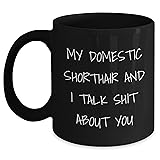 - Calling out to all Domestic Shorthair cat owners and lovers! Show off your feline friend's sassy side with our exclusive black coffee mug, featuring the hilarious quote, "My Domestic Shorthair And I Talk Shit About You." This 11oz or 15oz ceramic mug is the purr-fect gift for any occasion, especially Father's Day. Whether you're sipping your morning coffee or enjoying a cozy evening drink, this mug will add a touch of humor to your day. Our Domestic Shorthair Cat Black Coffee Mug is made from high-quality ceramic, ensuring durability and longevity. It's microwave and dishwasher safe, making it both convenient and easy to care for. The sleek black finish and bold white lettering create a striking contrast that will complement any kitchen decor. The generous capacity allows you to enjoy your favorite beverages without frequent refills. This unique mug is not just a coffee cup; it's a statement piece that reflects your love for your furry companion. Imagine the smiles and laughter it will bring to your dad, brother, or any special person in your life who shares your passion for Domestic Shorthair cats. It's the paw-fect way to show them you care and appreciate their love for their feline friend. Don't miss out on this opportunity to add a touch of feline humor to your daily routine or make someone's Father's Day extra special. Order your Domestic Shorthair Cat Black Coffee Mug today and let the shit-talking begin!