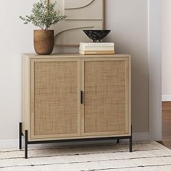 - Embrace the eclectic charm of bohemian aesthetic beautifully mixed with modern design with the Andrew accent cabinet! A definite eye-catching piece, this cabinet highlights a light oak body and contrasting matte black legs for that contemporary look. The intricately designed cabinet doors feature natural rattan panels, adding a touch of warmth and texture so you can store your items and conceal them in style. The roomy interior has adjustable shelves with 5 cubbies to store books, toys, gaming console, or even your favorite chinaware. Here's a secret - the Andrew storage cabinet comes with interchangeable leg options, so you can have multiple units side by side and create a multifunctional table. Nathan James is the furniture company built for this generation. You don't need to spend a fortune to get quality design-first furniture and when we say easy assembly, we mean it. Our guarantee is our word. Your purchase is backed by a 100% money-back guarantee. If you have any quality issues just contact us and we will send you a replacement immediately—no questions asked. This product is not recommended for commercial use. Materials: - Natural Cane - Metal - MDF - Paper Laminate - Particleboard Assembly Must-Haves: - Packaging carton as working surface Weight Limit: - 100 lbs. on top - 33 lbs. per drawer