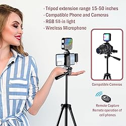 - The tripod included in the Vlogging Kit has a three-stage extension, so it can be used on a tabletop or placed on the floor for filming. It has a 360-degree adjustable head that supports horizontal, vertical and overhead shots. As a youtube starter kit, more types of videos can be produced. RGB fill light. Can not only achieve ordinary light (cold light, warm light, natural light), but also can achieve color single light and dynamic color light, as a content creator essential light, color light can provide more texture for portrait and still life shooting. Wireless microphone includes a lavalier multi transmitter and multi-function receiver, compatible with Lightning, Type-C, 3.5mm jack. Range is approximately 20 meters.