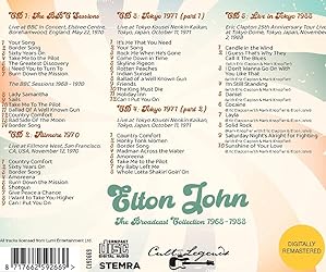 - Elton John - The Broadcast Collection 1968 - 1988 5CD Box SetCD1: The BBC Sessions. Live At BBC In Concert, Elstree Centre, Borehamwood, England, May 22, 1970 / The BBC Sessions 1968 -1970CD2: Fillmore 1970. Live At Fillmore West, San Francisco, CA, USA, November 12, 1970CD3: Tokyo 1971 (Part 1). Live At Tokyo Kousei Nenkin Kaikan Tokyo, Japan, October 11, 1971CD4: Tokyo 1971 (Part 2). Live At Tokyo Kousei Nenkin Kaikan Tokyo, Japan, October 11, 1971CD5: Live In Tokyo 1988. Eric Clapton 25th Anniversary Tour Live At Tokyo Dome, Tokyo, Japan, November 2, 1988