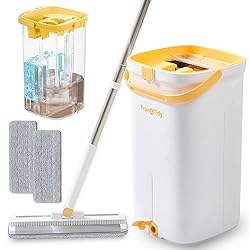 SEPARATE COMPARTMENTS FOR CLEAN AND DIRTY WATER – Featuring dual compartments, this system ensures the mop always uses fresh water for cleaning, keeping your floors and surfaces impeccably clean every time. 360° SWIVEL MOP HEAD – Effortlessly clean hard-to-reach areas and surfaces with the versatile 360° swivel mop head. MACHINE WASHABLE MICROFIBER MOP PADS – Save money on refills with the included microfiber mop pads, which are machine washable and can be reused up to 100 times. HEAVY-DUTY ALUMINUM MOP HEAD – Made from strong aluminum, this durable mop head lasts longer than plastic ones, ensuring your mop bucket set stays in great shape. WET AND DRY MOPPING – Use it wet for deep cleaning or dry for dusting floors, ceilings, windows, and more. BUILT-IN BRUSH SYSTEM – The integrated brush system efficiently removes hair and pet fur from the mop pad with every use.