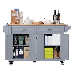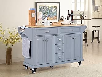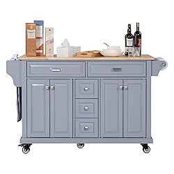 - Crafted for both style and function, this rolling solid wood kitchen island features a durable rubberwood top and a lacquer finish—offering a more premium and long-lasting alternative to paper laminate or paper-wrapped options. The sturdy solid wood frame is built from solid wood and real wood veneered MDF panels, all finished with multiple coats of layer paint for a smooth, clean look. 2 big drawers, and 3 bottom drawers; Two large cabinets with adjustable shelves give you flexible storage for cookware, pantry goods, or dinnerware. All drawers glide smoothly on full-extension ball-bearing slides for better access and durability, while the metal handles provide a sturdy, refined touch. Designed to move, the mobile prep station with towel and spice racks sits on five heavy-duty casters (two locking), letting you reposition it easily as a prep table, storage unit, or coffee bar. Spice racks and towel bars on both sides add extra convenience, and the painted finish is available in white, black, gray, blue, or mahogany to match any kitchen style. Assembly is simple with labeled parts and step-by-step instructions. If any parts arrive damaged or defective, we’ll gladly send replacements for free—and we also support Amazon’s hassle-free return policy. *Product Care: 1. Wipe with a soft dry cloth. Avoid the use of harsh chemicals and household cleaners as they may damage the finish. 2. Hardware may loosen over time; periodically check that all connections are tight.