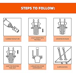 HIGH QUALITY MATERIALS: Rivet nuts are made of high quality steel, not easy to break or deform, with galvanized coating on the surface, which is rust-proof, durable and corrosion-resistant, prolonging its service life in various environments. THREAD SIZE: M5 x 0.8mm; Drill Size: 7mm / 0.27“; M6 x 1mm; Drill Size: 7mm / 0.27 M6 x 1mm; Drill Size: 9mm / 0.35”; M8 x 1.25mm; Drill Size: 9mm / 0.35 M8 x 1.25mm; Drill Size: 11mm / 0.43”. Fastener Type: Hollow. EASY TO INSTALL: Pre-drill a suitable hole according to the size, then insert the plus nut and tighten it with a tool, the operation is very simple and convenient. APPLICATIONS: Multi grip rivet nut can be firmly fixed on thin metal plates to provide the locking force for fastening screws, such as metal plates or non-metallic materials, plastics, wood, etc. Widely used in industry, construction, furniture, electrical appliances, equipment and other fields. PACKAGE INCLUDED: You will receive 30pcs rivet nuts (10pcs each of M5 rivet nuts, M6 rivet nuts, M8 rivet nuts). Pre bulbed rivet nuts are widely used for industrial and construction fasteners, its sturdy structure makes it a practical choice for securely riveting various plates.