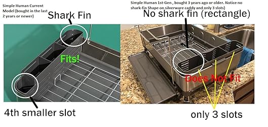Compatable with current model Simple Human Dish rack (bought in the past 2 years or newer) Fits both Regular and Compact size racks Designed and Printed Custom for simplehuman (tm) Dish rack modern version Hollow design for more air flow to dry knives faster Color match not exact DOES NOT FIT OLDER SLIM-LINE WIRE RACK MODELS or 1st Gen Simple Human Dish Rack (non shark-fin shape) (3+ years or older) Now with WIDER slots for thicker knives (4.5mm Wide vs older 3.0mm Wide slots)