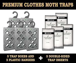 Effective Clothes Moth Control: Targets Webbing and Case-Bearing Moths to protect your garments and prevent damage. Non-Toxic and Odorless: Safe for use in homes, made with non-toxic, industrial-grade sticky glue. Easy to Use: Simply peel, insert, and place traps in closets or storage areas. Each trap provides up to 3 months of protection. Safe for Fabrics: Ideal for protecting wool, cashmere, silk, leather, and other fabrics from moth damage. Complete Kit: Includes 5 trap boxes, 5 adhesive inserts, and 5 hangers. Each adhesive is individually sealed for maximum effectiveness.