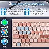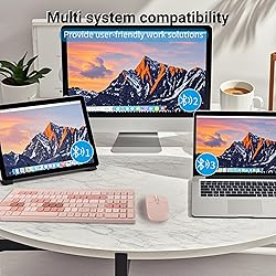 [Multi-Device Connection]: With dual Bluetooth and 2.4G USB mode, within 33 feet without any delays. the wireless keyboard mouse combo can be connected to 3 devices simultaneously, effortlessly realize seamless switch between 3 devices by pressing Fn+1/2/3. [Rechargeable and Energy Saving]: Built-in rechargeable lithium battery, this keyboard and mouse combo can be easily charged with included type-c charging cable (included in the package).The Charging time is about 1 hours.and Standby time is about 3 months.There is a battery display above the mouse. [Fashion Design & Compact]: Portable design, durable ABS+PC material and colorful paint fully manifest its graceful appearance. Smooth and low-profile large keys with number pad offer quiet and comfortable typing. Aesthetic elegant look,slim and professional design spruces up your workspace. [Perfect Shortcut Keys]:Full-size layout with numeric keypad and convenient multimedia keys makes typing much easier and more comfortable, get instant access to applications and media control in easy reach. [Sensitive Response ]: Low profile keys, a scissor mechanism beneath each key allows for increased stability, silent to press and rebound quickly. [Multi-System Compatible]: The Bluetooth keyboard mouse combo is compatible with Mac OS, Windows, iOS, Android etc.within 33 feet without any delays. One plug and play 2.4G USB receiver (stored on the bottom of the keyboard) or via Bluetooth can connect both the keyboard and mouse without installing additional software or driver, ensures a stable and reliable connection.