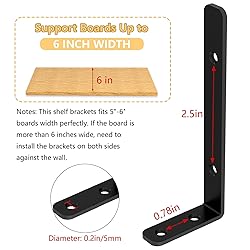 【High Quality Metal】: This heavy duty shelf bracket is made of high-quality solid metal steel, coated with a matte black finish, with a sleek and modern look. Rust-proof, corrosion-resistant, and smooth edges to prevent scratches during installation. Suitable for all kinds of DIY projects and long-term use 【L-Shaped Structure】The corner brace is designed in an L-shape, with a perfect 90-degree angle, strong structure, more sturdy, and not bend easily or deformation. Sinking screw hole design, hidden screw installation, more beautiful appearance. L Bracket Size: 5"× 2"(125mm×50mm), 3mm thick. Max load: 42 lbs / 19 kg 【Wide Application】This small and sturdy L corner bracket is strong enough to be used for any shelf support bracket installation, furniture, wall shelves, etc., such as bookshelves, table shelves, chair corners and garden shelves, etc. Despite its small size, these black shelf brackets can play a good role, and can be used up or down to make your home or garden even more beautiful 【Easy to Assemble】The 6-pack wall shelf brackets come with screw accessories and instructions. Easily install your favorite shelves in shops, home offices, bathrooms, kitchens, living rooms, dining rooms, bedrooms, garages 【Quality Assurance】Our corner braces are produced under high quality control, with smooth surface and stable structure. If you have any problems with this floating shelf bracket, please feel free to contact us