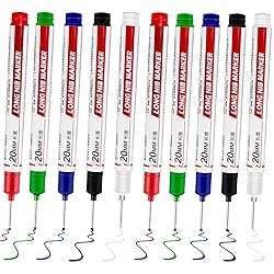 ✎Package Included: You will get 10 x long nib markers. Long head deep hole markers contain 5 different colors(black, white, red, green, blue), each color is 2 pieces. Sufficient quantity can meet your uses and replacements ✎High-Quality Material: The construction markers are made of premium PP material, strong and sturdy. The nib is thin and round, the handwriting is not easy to fade, easy for you to handle ✎Deep Hole Mark Nib: Size of the nib is 20 x 1.5mm. Long head deep hole marker nib features an elongated nib that can fit between narrow gaps or write inside small spaces ✎Fast Dry: Long nib marker is quick dry, and waterproof, and the color not easy to fade. So you don’t have to worry that the handwriting will faint after writing ✎Wide Use: Multi-purpose deep hole markers are suitable for marking and drilling positions and furniture decoration, also can mark most dry and dust-free surfaces like aluminum, metal, concrete, glass, wood, plastic, etc.