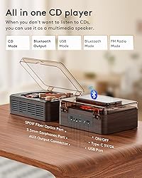 Multi-Function CD Players for Home: Support CD/ CD Bluetooth transmitter/ USB/ Bluetooth/ FM radio mode, with remote controls,3.5mm,AUX,S/PDIF Prot Speakers-Bass Boost: Sound quality is enhanced by a fully sealed wooden cabinet, and the remote control allows for one-touch bass boosting and bass lowering to increase treble settings Bluetooth Input and Output: It supports receiving external Bluetooth devices in CD mode to listen to your favorite CD music, or you can use the wooden small CD player as a Bluetooth speaker Top-Loading CD Player: The appearance is a scaled-down version of a record player, but it is a multifunctional all-in-one CD music player. Compact design, portable. It is corded powered device Easy to use: top opens to hold CDs, toggle switch, voice mode alert, rotary volume button, easy to understand buttons. Make it easy to use for the elderly and children Retro CD Player: HiFi Stereo Sound for Audio Books; Widely compatible with CD, CD-R, CD-RM, CD-G, MP3, WMA, WAV formats Package includes accessories: CD player*1, 5V-2A USB adaptor*1,Charging Cable*1, 3.5mm male-to-male audio cable*1,Remote control, User manual*1
