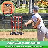 9 POCKET PITCHING NET: Practice pitching skills anytime, anywhere with no catcher needed; Visualize key pitching areas to improve accuracy, and spend less time collecting balls; Measures 49 x 30 inches (H x W), similar to a real strike zone ACCURACY TRAINING AID: Numbered pockets help with coaching players to aim for specific areas of the strike zone and provide instant feedback for where your pitches are going; Great for baseball & softball pitchers of all ages & abilities STURDY & TIP-RESISTANT: The steel frame features robust fiberglass poles and durable polyester netting to withstand countless pitches season after season; Includes 2 sandbags (sand not included) and 2 stakes for stability on fields & grass PORTABLE & QUICK SETUP: Easy to set up and use on any surface; Store in the included carrying case for instant practice anywhere COACH APPROVED: Great for developing pitching skills and teaching kids how to spot; Coaches can call out the zone numbers for easier player instruction