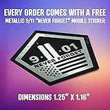 Proudly MADE IN THE USA and manufactured from high quality self adhesive vinyl. Sticker Dimensions: 2" x 1.53" with a bonus 9-11 special edition metallic sticker. Each order includes PATRIOTIC NEVER FORGET METALLIC STICKER - 1.25" W X 1.16" H (See photos). Simply peel off the backing and apply to a clean, smooth surface like your car window, vehicle body, your laptop, or even your tablet! Weatherproof - UV laminated, resists direct sunlight and water easily lasting 5-7 years in an outdoor environment.
