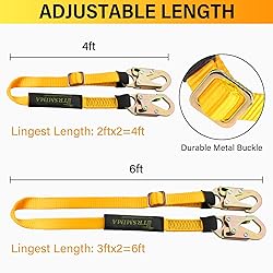 NOT FEATURE SHOCK ABSORPTION:Made of 100% polyester webbing safety lanyard This restraint lanyard is not for fall protection and does not feature shock absorber.Usually compatible with a waist belt or safety harness siding d-rings.NOT suitable for a fall protection lanyard. Length Adjustable:Adjustable length from 4 feet to 6 feet,the length of the fall protection flat single leg lanyard can be adjusted quickly and accurately during installation, making it easy for you to adjust the seat belt with one hand, very humane and considerate. High Quality Hook:The heavy duty stitching to keep you safe on the job a sturdy steel snap hook,which can prevent rust and has good strength and toughness. The maximum tensile force is 22540 N and it break With a strength of 5070 pounds,it provides great "relief." Increased safety levels:Fall restraint Lanyards are suitable for construction,climbing,arbor,logging,inspection,emergency and rescue services,roofing,welding,military and other professional workplaces that require safety and fall protection. With this lanyard fall protection rope with large snap hooks,you can always stay smart and safe. Easy to Use:Must be used with approved tree belt,climbing belt or safety belt before using our fall protection lanyard. Our safety tree strap are excellent products that allow you to free up your hands when hanging a stand or foot pedal with a belt,which makes the work on the stand easier,and it is safer to operate,avoiding dangers and rest assured use.