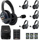 True Wireless Full Duplex Communication: Connect up to 16 users without a base station for seamless hands-free communication. Two simultaneous talk channels allow separate groups to converse privately, with easy expansion to meet growing needs. Advanced Interference-Free Technology: Features Active Frequency Hopping, automatically switching channels to avoid interference. Enjoy a robust operating range of over ½ mile (1000 yards) line of sight, ideal for large work areas or events. Exceptional Audio Clarity & All-Day Comfort: Equipped with an auto-mute microphone that activates when the boom is in the "up" position. Durable metal construction, stainless hardware, and deluxe extra-wide ear pads ensure both clarity and comfort throughout extended use. Long-Lasting Battery Performance: High-capacity Lithium Polymer batteries deliver up to 10 hours of continuous operation. Includes a 10-port charger for efficient recharging, ensuring your headsets are always ready for use. Complete Package for Versatile Use: The set includes 1 Single-Ear MAIN Headset, 5 Single-Ear Remote Headsets, a 10-Port Charger with Adapter, 6 Lithium-Polymer Batteries, and a Large Soft Padded Case with StarlitGem Cleaning Cloth making it perfect for team collaboration and various professional applications.