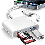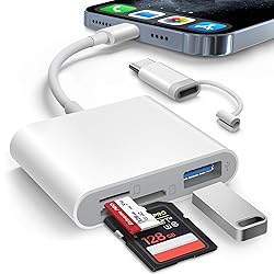 DESIGNED FOR PHOTOGRAPHY CREATORS: The AkHolz SD card reader is a photography accessory for KODAK Canon Nikon DSLR digital hunting trail cameras. No third-party apps required. Plug in your iPhone and use iOS built-in “Photos” to import photos videos with one click. Or use the iOS built-in “Files” to import and export any files. DUAL CARD SLOT DESIGN: The AkHolz card reader for iPhone connects to both Lightening and USB-C ports to read either full size SD SDHC and SDXC cards or the newer microSD, microSDHC and microSDXC cards, makes this sd adapter incredibly versatile and valuable. Please note it is not compatible with less common formats like XD-MS cards USB FEMALE DESIGN: The AkHolz Lightening to SD USB adapter is not only designed with dual memory card slots, but also designed with USB-A female port, it is an OTG camera adapter for iPhone & iPad, supports digital cameras, DSLR cameras, hunting trail cameras, USB flash drives, card readers, USB headphones, electric guitars, MIDI keyboards, keyboards and mice. This USB Camera SD Adapter does not require an additional application or removal of the camera's memory card. Printers are not supported. DUAL-CONNECTOR DESIGN: The AkHolz SD card adapter features both Lightening and USB-C port capability (comes with a USB-C to Lightening adapter), plug the USB-C end of the adapter into the USB-C connector on your iPhone or iPad, then connect the Lightening card reader. Lets you to connect to USB-C enabled iPhone 15, iPhone 16, iPhone 17, iPad, Mac or even Android and Pcs to conveniently provide data OTG functionality. The AkHolz dual-connector SD adaptor also lets you to go back and forth from your Android Windows to Apple devices, transferring video or whatever else. PLUG AND PLAY: The AkHolz memory card reader for iPhone iPad, no drivers or special setup are required, no network, no caching, and directly recognizes the memory cards for selecting photos videos to import vis iOS's Photos system. TWO-WAY TRANSFER: The AkHolz SD card reader supports two-way transfer, plug it into the iPhone's port and using the iOS's Files system, was able to see photos from your camera's SD card or download pictures to the card. Plug and play, easy to import and export a variety of file types including photos, videos, music and documents. YOU HAVE TO HAVE THIS: If you like to take photos for fun or even if you are a photographer on the go who'd like to view their photos on a iPhone or iPad - possibly even uploading some from the field before, you need this! Plug it right into your phone and the photos videos load so quick in your albums and able to save them. It is quick and so simple.