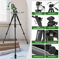 - [3*360 Optional Laser Lines] Huepar 360 laser levels have one 360 horizontal beam and two 360 vertical beams can be easily projected to various locations in the room from the top of the laser level. The "H", "V1", and "V2" laser line buttons on the control panel respectively control one laser line. You can easily switch to any laser you want. It is laser Class 2 (IEC/EN60825-1/2014), <1mW. [Additional Laser Level Tripod and Magnetic Bracket] The 1/4”-20 thread at the bottom of the laser level is suitable for the high-quality tripod and 360 magnetic bracket included in the set, as well as other standard tripods and brackets. The sturdy and versatile tripod for laser level included in the set can extend from 17” to 50 in height, helping you adjust the position and height of the laser line level. The magnetic bracket included in the set can rotate 360 degrees and firmly adhere to the metal surface.