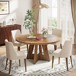 - The Tribesigns Farmhouse Dining Table embodies rustic charm and modern utility in a 47-inch round table built to comfortably seat four people. Crafted from hardy, high-quality wood, this table showcases a gorgeous rustic brown finish, complementing any existing home décor while adding a touch of farmhouse appeal to your dining space. Its round design not only fosters intimacy and warm conversations, but also fits effortlessly into compact spaces without compromising comfort or style. Beyond its function as a dining table, this piece can seamlessly function as a centerpiece in your living room or a casual coffee table, bringing versatility to your home furnishings. Despite its robustness and intricate design, this table ensures an easy assembly with all the necessary tools included in the package. Embrace the simplicity of country living without sacrificing urban sophistication with the Tribesigns Farmhouse Dining Table.
