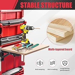 Accessible Work Surface: Provides a spacious, flat worktop for electronics, notes and any tools, making it convenient for accessing tools and performing various activities,such as repairs, assembly, or maintenance Compact and Convenient: Designed with portability in mind, this workbench effortlessly folds flat for easy storage and transportation. When unfolded, it quickly transforms into a stable workspace, maximizing your job site efficiency The workbench tops are made of high-quality wood, with a clear texture, stability prevents warping and cracking for long-lasting performance Super Support: The folding shelf brackets are made of powder-coated steel to prevent rusting. The sturdy steel construction frame can handle up to 200 pounds, providing a reliable work platform Exclusived Fits:Designed exclusively to snugly fit for the Milwaukee Packout rail, ensuring a seamless integration into your storage system