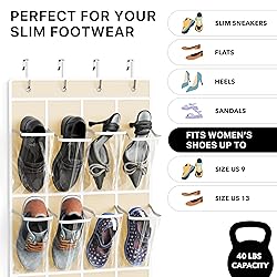 Maximize Storage with 24 Clear Pockets: Overall size 19" W x 64" H Pocket sizes: 4.3" W x 9.5" H, extra 2 inches on the top row for your larger shoe Easy Over-the-Door Installation: Hassle-free setup, hang and use instantly Includes 4 Durable Metal Hooks: Fits standard doors up to 1-3/8" in thickness; 4-point hanging design provides strong and balanced support Sturdy Fabric Base with Clear Pockets: Offers full visibility to everything at all times and is built to last 40 lbs Capacity & Wide Shoe Fit: Holds up to 40 pounds; suitable for slim shoes, small-size sneakers, flats, sandals, and heels Versatile Storage Beyond Shoes: Perfect for clothes, diapers, dry goods, pantry items or household essentials