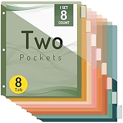 Easier Organizer & Divider: 3 Holes punched, fit in standard 3 ring binders. Our premium binder folder dividers have slash pockets, so you can keep your papers organized and easily locate them with colorful tabs. 2 Pockets for Handy Storage: Equipped with two-sided slash pockets, this dividers with folders allows you to store loose sheets, assignments, or 8.5x11 loose-leaf handouts. Pockets on the front and back of the divider are super convenient for quickly putting away papers. 8 Tabs for Quick Access: Multicolored 8 pre-labeled tabs allow you to categorize and navigate your documents with ease. Each tabs is clear, and it's easy to read what's underneath, so you can quickly find what you need and keep everything organized in a busy classroom. Quality-Made for Heavy Use: Made from durable, and well-weight PVC material, these tear-resistant folder dividers for 3 ring binder are strong and sturdy to withstand frequent use and hold up nicely, ensuring your important documents remain safe. Colorful Design for Color Coding: Our binder divider folders and labels are multicolored. Perfect for keeping things separate for different subjects, it comes with writeable labels to organize everything by color and name.