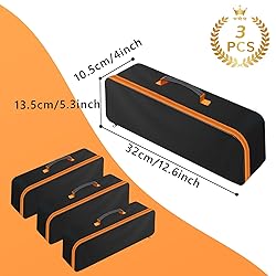 【High Quality Material】 These tool bags are made of waterproof oxford cloth, light weight and foldable, tough and durable, easy for you to carry and store and prevent punctures and lost tools. 【Unique Design】 Unique wide open design, making it convenient to quickly put in or take out your tools when needed. The reinforced handle and smooth zipper enhance your user experience. 【2 Sizes to Choose】There are 2 sizes available for you to choose from, pay attention to the size to purchase the tool pouch that meets your requirements. 【Size】3 pack tool bag, meet your diverse storage needs. Each one measures 12.6" L*5.3" W*4" H, 32cm L*13.5cm W*10.5cm H. 【Multifunctional】The zipper utility tool bag is not only for tool storage but can also be electrician's bag, woodworking bag, camping bag, electrical repair bag, car vacuum bag.