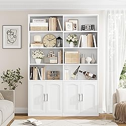 Tall Bookshelf with Doors - Enjoy the best of both worlds with open shelves for easy access and display, combined with enclosed storage cabinets for items you want to keep out of sight. The bottom doors prevent your books and items from dust, keeping them clean and well-preserved over time. Double Storage Space - Designed with extra-wide to maximize capacity for accommodating a large number of books. This large bookcase is pretty suitable for avid readers or home lovers who need ample storage and tidy space. Stable and Sturdy - Anti-tipping device and enhanced load-bearing capacity (up to 33 lbs per shelf) ensure that big bookshelves can hold a large amount of items without tipping or sagging. Modern Open Bookcases - The vertical shelving structure offers a flexible storage and display solution, while the silver handles and arched facade add a touch of style to your home. Both utility and beauty. Easy to Assemble : It's easy to put it together with clear and detailed instructions. One-time assembly provides you with double storage space with FACBOTALL white bookshelf.