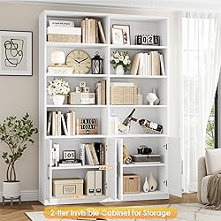 FACBOTALL Bookshelf and Bookcase with Doors, 6 Tier Double Wide Large Bookshelves, Open Display Shelves, 73'' Tall Bookshelf with Storage Cabinets for Home Office, Living Room, Library, White