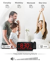 【Crystal Clear Projection with 350-Degree Adjustable Projector】This digital alarm clock offers a crystal clear projection, allowing you to easily read the time on the ceiling or wall, no need to roll over and check your phone. Finding the ideal wall or ceiling spot for the projection isn't difficult either. Its 350-degree adjustable projector makes the job easy for you. Furthermore, the projection intensity can be adjusted with 5 dimmable levels. The optimal projection distance is 5 to 10 feet.【 【Digital Clock with Date and Day of Week&Temperature&Humidity】 This digital clock displays more information at a glance than any other clocks, showing the time, date and day of week alongside the indoor temperature and humidity level. Additionally, the temperature can be switched from ℃ to ℉ simply by pressing "DIM/℃/℉" button, help to create the most comfortable living conditions for your household. 【Large LED Display&5 Brightness Levels】 Measured 7.9W*3.4H, this clock has a large digital display, making it easy to read at a glance. If you're bothered by ambient light glowing from your clock, this large display digital clock has 5 brightness settings, which is particularly helpful for those who prefer dimmer lighting for a good night's sleep. The brightness of the LED display and the projection display can be adjusted separately. 【Dual Alarms with 7 Adjustable Volume Levels】Equipped with dual alarms and separate weekend/weekday/all-7-day/one time mode, ensures that both you and your partner can wake up to personalized settings. This loud alarm clock for heavy sleepers is equipped with 7 adjustable volume levels, the highest volume can reach 116db, which is loud enough to wake up even heavy sleepers or seniors. 【9-Min Snooze&Night Light】 This alarm clock for bedroom also offers a snooze function, simply hit the big SNOOZE button at the top to get extra 9 minutes sleep, makes you wake up on time. The snooze button also allows you to change the backlight brightness to 2 different levels, best for used as an ambient light to help you find your way in the dark.