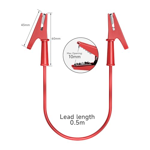 - Both ends of the test leads are pure copper full insulated alligator clips. The maximum width of the crocodile clips opening is 10mm. Lead length: 1.64ft. Voltage: 1000V. Current: 15A.