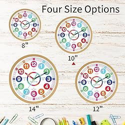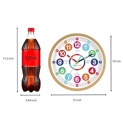 1、【Clear & Easy to Teach for Kids】: This kids wall clock has all the information you need to teach time - minutes hands and quarters are labelled making it easy for kids to understand 2、【Perfect Size for Children to Use and Decorate】: The wall clock is more suitable for children to use for learning and use, children can easily hold it in their hands for learning 3、【Scientific Design & Rich Color Combinations Make it Easy to Learn】: The face of the wall clock is scientifically designed and laid out in such a way that children can easily and quickly learn how to tell time. The colorful design of the wall clock can arouse children's interest in learning the time. 4、【Silent & Non-ticking】: Our telling time teaching clock is a silent and non-ticking clock with a stylish continuous sweep movement making it great room decor for kids rooms, classrooms nursery or home school and create a quiet place for children to study and rest. 5、【A Great Gift for Kids、Parents and Teachers】: A perfect gift for children to learn to tell time and for teachers to teach. (1 AA battery required (not included)