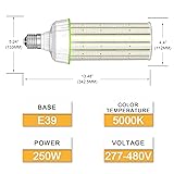 Notice: Only used in open fixtures. The 480v LED corn light bulb 250w will burn up if you use in an enclose fixture. Our 5-year service does not cover damage caused by using in enclosed fixtures Ultra Bright: The 5000K 250W led corn cob with 37,500 lumens and 360 degree beam angle fits to be 1000W HID Replacement retrofit. The installation height is recommended between 16 ft and 22 ft Easy Installation: Available for working voltage from 277 to 480V AC. E39 Base is easy to Connect directly a screw base. ( Must remove or bypass the ballast in your electric circuit before installation ) Energy Saving & Long Lifespan: The corn cob light bulb reduces more than 90% electricity consume than traditional light. This led corn light bulb has 50,000 hours lifespan, lasting over 23 years with daily 6-hour use Widely Used: High power LED Bulbs are great for high ceilings, workshops, high bay shop light, home & garage lighting, warehouse light, office lighting, wall pack light, garage light, barn light, pendant light, offer a stable and durable lighting solution for commercial & Industrial project. ( Tips: E39 LED Corn Light is not suitable for use in dusty/water vapour environments )