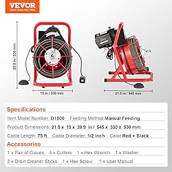 - Specifications Item Model Number: D1000 Feeding Method: Manual Feeding Cable Length: 75 ft Cable Diameter: 1/2 inch Color: Red + Black Net Weight: 75 lbs / 34.05 kg (including all accessories) Product Dimensions: 21.5 x 13 x 20.9 in / 545 x 330 x 530 mm Package Content 1 x Pair of Gloves 4 x Cutters 1 x Hex Wrench 2 x Drain Cleaner Sticks 1 x Hex Screw 1 x Washer 1 x User Manual