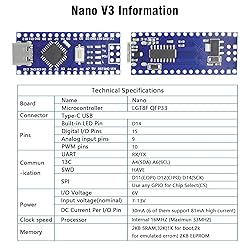 - Description:Nano V3.0 Atmega328P Microcontroller with CH340 USB to TTL is the perfect tool for Arduino enthusiasts. Featuring an improved Atmega328P chip, this development board offers enhanced processing power and stable performance for all your Arduino projects. The integrated CH340 USB to TTL converter ensures reliable and fast communication with your computer, making it easy to program and upload sketches. The package includes a high-quality USB cable for convenient setup. Specifications:Microcontroller: ATmega328PUSB to Serial Chip: CH340Operating Voltage: 5VInput Voltage (recommended): 7-12VInput Voltage (limit): 6-20VDigital I/O Pins: 14 (of which 6 provide PWM output)Analog Input Pins: 8DC Current per I/O Pin: 40 mAFlash Memory: 32 KB (ATmega328) of which 2 KB used by bootloaderSRAM: 2 KB (ATmega328)EEPROM: 1 KB (ATmega328)Clock Speed: 16 MHzUSB Connector: Type-CUSB Cable: Included in the packageDimensions: 43 mm x 18 mmWeight: Approximately 7g Product Packaging:5 X Nano V3.0 Board with Cable