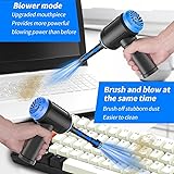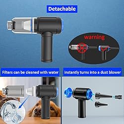 Innovative 3 in 1 Multifunction:It is not only a mini vacuum cleaner, but also an air duster and air blower.One end of the machine is connected to the nozzle for vacuuming, and connected to the vacuum slot, which turns into an air pump for travelling, and your vacuum storage bags are airtightly vacuum-packed. while the other end is connected to the nozzle for blowing dust. Nice price and multiple combinations make this computer vacuum cleaner a perfect gift for your family members or friends. Multiple accessories for different occasions:The accessories of this PC cleaner have at least 6 combinations, which can be used as keyboard cleaner, car interior cleaner. It can not only solve the dirt in hard-to-reach places, but also work on crevices or camera lens.(The blow nozzle and flexible hose are packed together, please don't miss it when you open the package). Reliable Lithium Battery Technology & Long Battery Life:The compressed air has 2 built-in 2500 mAh lithium battery (5000mAh), passes 500 charging cycle tests, could provide a long running time for work, and only needs 3-4 hours to be fully charged each time. Smaller size, Stronger suction: The computer cleaner has a length of 7.67in, a diameter of 2.5in and a weight of 0.73lb, but it’s motor has 80W power and can provide 14500pa cyclone suction, can capable of 110000rpm.Simply turn on the power and you can switch between 3 different air speeds with button. Reusable and washable filter:Comes with 1 filter (on the machine), filter can be reused after water washing.The mini vacuum adopts dust container design and its filter meets High Efficiency Particulate Air (HEPA) standard. It is easy to empty, replace and clean.