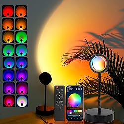 【Smart APP & Remote Control Sunset Lamp】This magical sunset lamp projector perfectly integrates art and technology, freeing you from being limited to fixed color modes. Control the sunset projector lamp through the app or remote for access to advanced modes such as unlimited RGB color options, dynamic modes, music, microphone, and timer modes, etc. With just one operation, a visual feast of lights will be displayed before your eyes. 【Endless Colors RGB Led Lights】JIMEI sunlight lamp projector light up your room with sunset light/ Rainbow light, and color changing as sky blue, rose pink, forest green... Choose from over common 16 colors and 4 dynamic modes via remote or app, meeting the different lighting needs of users in various scenes. 【Full Angle Adjustable lamp】360 degree twisting hose. The hose technology of JIMEI sunset lamp solves the problem of rotation lag and has greater freedom of use. You will not affected by the angle when using the projection lamp. 【 HD Crystal Lens】The Sunset Projection Lamp has an HD Thickened crystal lens. strong light transmission and refraction wider light-emitting surface, farther distance, and larger projection range. Make more beautiful night lights effect. Energy-saving and 60000 hours long life span with top-quality LEDs. 【Cool Stuff-Fantastic Visual Experience for You to Create】Are you in love with night light projector? JIMEI sunset lamp can create those cool atmosphere for living room, bedroom, birthday party room decor, etc. Create your next photograph/ video Vlog, TikTok, Instagram, Twitter post. Great ideal for new year decoration. Let all the sunset light gather on you...