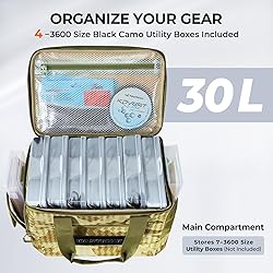 - Upgrade your fishing gear organization with the KastKing BaitSpace Tackle Bags, designed for durability, convenience, and maximum storage. Made from tough nylon oxford fabric with a waterproof PVC coating, these tackle bags shield your gear from the elements. A protective EPE foam layer and 230D fabric lining add durability, while non-slip feet provide stability on wet or uneven surfaces. Each bag includes four 3600-size black camo utility boxes, plus a detachable soft bait binder with six clear-view bait sleeves, an internal mesh slip pocket, an adjustable elastic band, and a detachable shoulder strap. The binder is also interchangeable with other KastKing BaitSpace products, like the Leader Line Bag and Lunch Bag. The Large KastKing Tackle Bag holds up to 9-3700 size and 2-3600 size utility boxes, with additional storage in multiple zippered, mesh, and slip pockets, including a water-resistant zippered pocket inside the lid. The Medium Tackle Bag holds 8-3600 size utility boxes and includes an end zippered pocket, a flip cover slip pocket, a buckle-closure side pocket, and lid storage compartments for easy access. Designed for anglers of all levels, these tackle bags feature double loop zipper pulls for quick entry, a padded handle, and an adjustable, removable padded shoulder strap for easy transport. Stay organized and ready for any fishing adventure with the KastKing BaitSpace Tackle Bags.