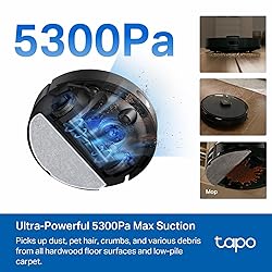E𝗳𝗳𝗶𝗰𝗶𝗲𝗻𝘁𝗹𝘆 C𝗹𝗲a𝗻𝘀 Y𝗼𝘂𝗿 H𝗼𝗺𝗲: Effectively removes dust, pet hair, crumbs, and debris from all hardwood flooring surfaces and low-pile carpet. Activate Ultra mode for up to 5300Pa ultra-powerful suction when extra cleaning power is needed. N𝗼 S𝗽𝗼𝘁𝘀 M𝗶𝘀𝘀𝗲𝗱: Utilizes Mesh Grid Technology, a unique grid-like cleaning pattern for thorough coverage, ensuring effective cleaning and preventing missed spots. Ca𝗿𝗽𝗲𝘁 A𝗿𝗲a F𝘂𝗻𝗰𝘁𝗶𝗼𝗻𝘀: Robot increases suction on low-pile carpet to catch hidden dirt and grime and avoids carpeted areas when in mopping mode. Easily add your carpets and rugs on the Tapo app, then set your desired cleaning settings. O𝘃𝗲𝗿 97%◇ D𝘂𝘀𝘁 P𝗶𝗰𝗸𝘂𝗽 Ra𝘁𝗲: Our DeepVac technology is engineered with an optimized air inlet, an improved cleaning brush, and perfectly positioned air ducts, for superior dust removal and smooth, clog-free airflow. S𝗺a𝗿𝘁 A𝘂𝘁𝗼 E𝗺𝗽𝘁𝘆 D𝗼𝗰𝗸: RV30 Max Plus empties its dustbin automatically after each cleaning, storing debris in a large, disposable 3L sealed dust bag typically lasting for up to 60 days.